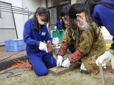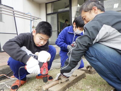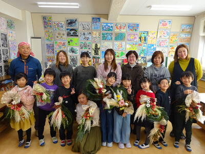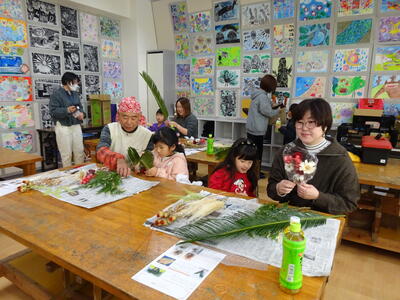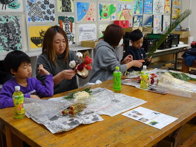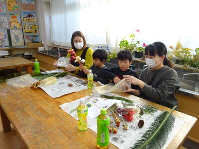 1年生と保護者の方がリースづくりをしました。ソテツを丸くして土台を作り、そこにドライフラワーなどをアレンジしていきました。集中してい取り組み、オリジナルのリースが出来上がりました。