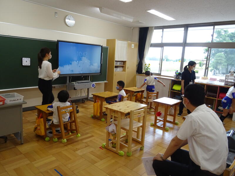 1年生、2組は、タブレットの使い方について、ICT支援員さんの指導のもと操作法を学んでいました。1組は、電子黒板に運動会の準備運動で踊る「中村体操」のデモンストレーションの動画を見ながら、動きを確認していました。3組は、電子黒板でヒントの画像をみながら足し算の考え方を学んでいました。