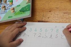 算数はたし算の学習に入りました。たとえば「3あって2ふえるといくつでしょう」という問題を式で表すにはどうしたらよいかを学習しました。「+」「=」の書き方を練習して、たし算の式に表しました。また、問題文を書くことで、今、国語で学習している促音「っ」の文の復習も行いました。