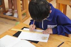 算数は、物差しを使って直線を書く学習を行いました。点と点を結ぶために、確実に2点上に物差しを合わせ、ゆっくりと線を引く練習を行いました。