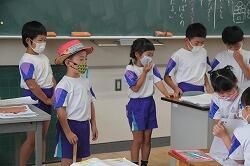 校長からは「不自由な中で、工夫した生活を送れたこと、遅れた学習を取り戻すために頑張った1学期でした。」と、次に「自分に自信をもって生活していこう。そして元気に2学期にまた会いましょう」と話がありました。