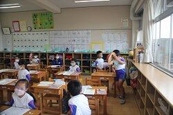 今日は「リズムを打って楽しく歌おう」を目当てに学習を行いました。写真の紅白帽子をかぶって歌う様子は、飛沫を防ぐために、交互の組で歌うためです。児童たちはリズム打ちが大好きです。歌いながらですとなおさらです。しかし、まだまだ全員で元気よく歌うことができないのが残念です。