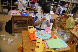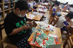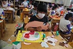 図工では、「ちょきちょきかざり」を学習しました。ここでは、自分の想像したことを紙を切って表します。あわせて、はさみの使い方も習得していきます。切る紙の枚数が増えるごとに、作品の精緻さが高まっていきました。