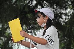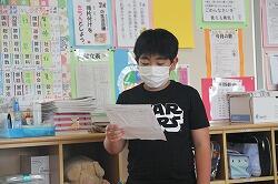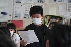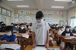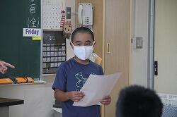 最初に児童代表の作文発表を行いました。今学期頑張ることを発表しました。6年生の代表は、コロナ社会の予測不能な中で、工夫して生活していくことを発表しました。
