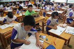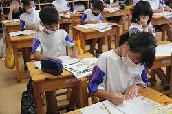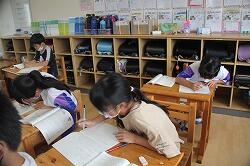 1年生の算数は、ひき算の文章問題を学習しています。今日は「どちらがどれだけ多いか求める」という課題です。問題文をしっかりと読み取り、何と何を比べているかを把握するのがポイントです。電子黒板に問題を表示しながら、国語の読み取りでした。問題文をよく読み取れるようになるためには、問題を解くだけでなく、普段からの読書が大切です。読書指導を継続して行っていきます。