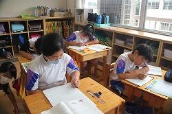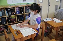 5年生にもなると画数の多い漢字を書きます。今日の書写では、一画目と二画目の始筆が同じときはどのように筆を入れるか学習しました。点画のつながりを考えながら練習しました。