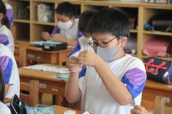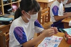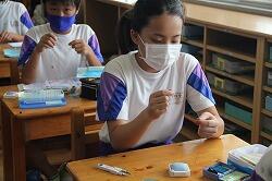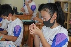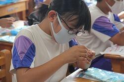 今日の家庭科は裁縫の学習です。針に糸を通して玉結びの練習を行いました。