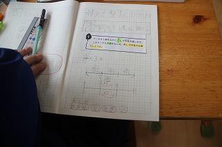 算数では、体積を求める学習をしています。今日は一片の長さが「m」となりました。子どもたちからは、「基準の1立方センチメートルがいくつあるか計算すればいい」と意見が出され、計算に取り組みました。0の数が7つ。とても大きい。じゃあ、どうすればやさしくなるかなあ。基準になるものは?と考えを出し合い、方法を見つけていきました。