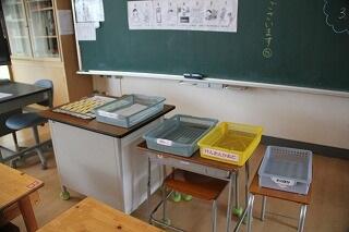 教室の入り口には消毒薬を設置してあります。