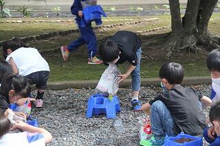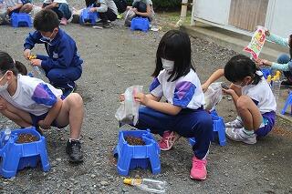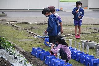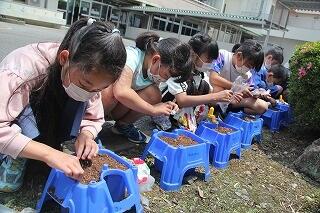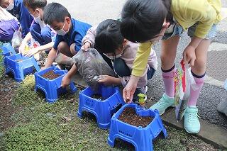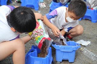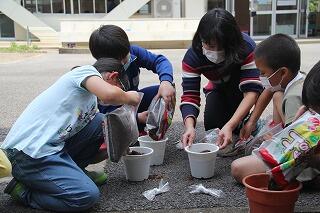 3年の理科ではホウセンカの成長の様子を観察します。今日は、教室で種のまき方を学習した後、外に出て、実践です。さすが3年生になると、土のにおいがちがうなと観察力が育ってきています。「栄養があるんだよ」と話すと「栄養って何?」と興味が次から次へと広がっていきました。スタートは遅れましたが、暑い夏も、しっかりと観察できますね。