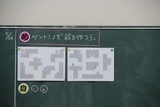 今日は「ペントミノで箱をつくる」学習を行いました。5つの正方形がくっついた図を工作用紙に描き、切り取り、折り目をつけて折っていくことで、平面図が立体になっていく(展開図の入り口)学習です。「こう組み合わせればいいんだ」とつぶやきがたくさん聞こえてきました。手を使って考えていく学習でした。
