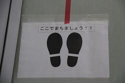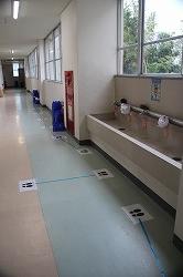 トイレ、水飲み場では距離をとるように立つ位置を決めています。また、水道は一つずつあけてあります。