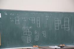 5つの正方形を組み合わせて形づくりを学習しました。組み合わせ方によっていろいろな形になります。いくつ発見できるか挑戦しました。