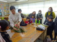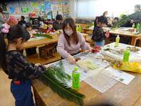 1年生と保護者の方がリースづくりをしました。ソテツを丸くして土台を作り、そこにドライフラワーなどをアレンジしていきました。集中してい取り組み、オリジナルのリースが出来上がりました。