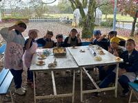 今日から宿泊学習が始まりました。6年生が入所し、勾玉づくり、風鈴づくりをしました。お昼はバイキング給食でした。3泊4日の長丁場ですがみんな元気です。