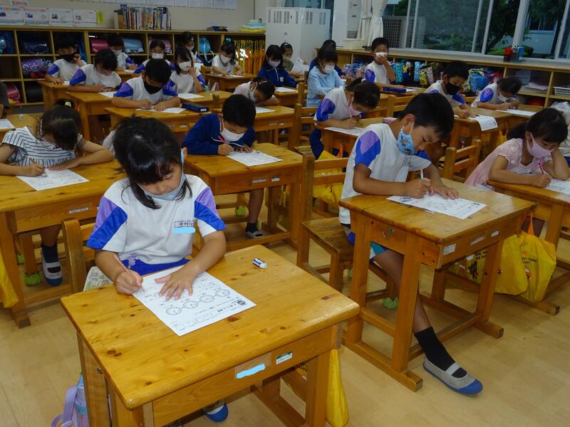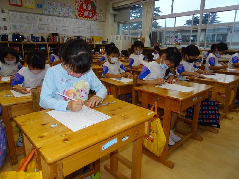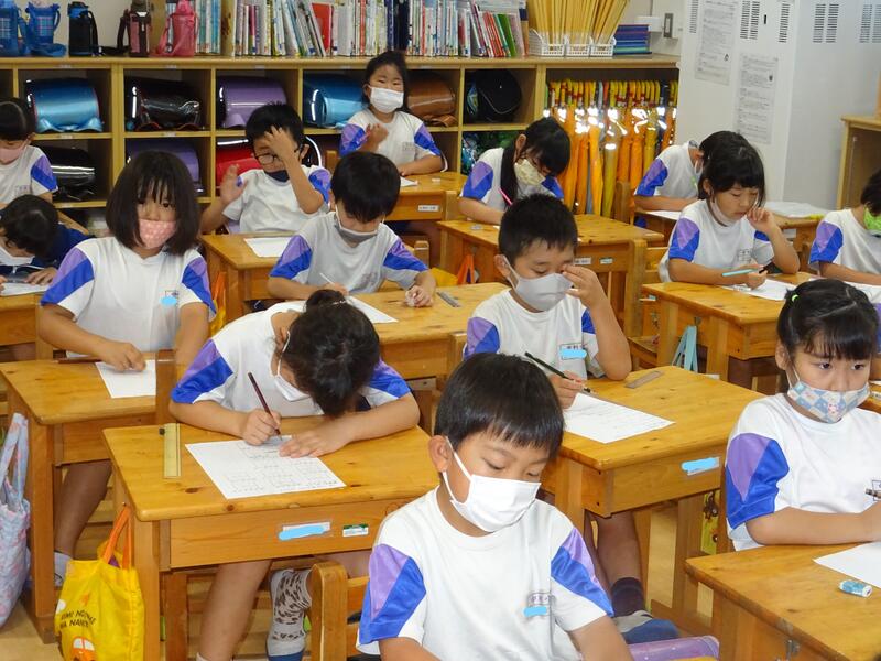 週に3日、15分間の朝の学習の時間が設けられています。登校してすぐ、8時になるとその日の課題に向けて真剣に学習に取り組みます。たった15分ですが、1年間これを真剣に続けたら、大きな力となります。2年生の教室を撮影しましたが、これと同じ風景が全学級で見られます。