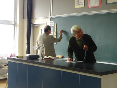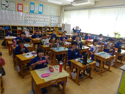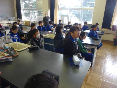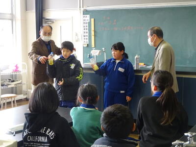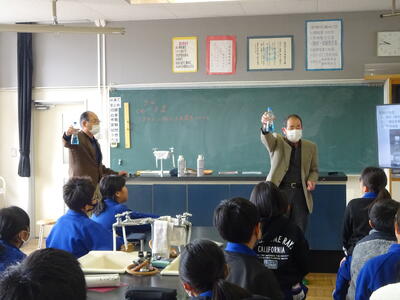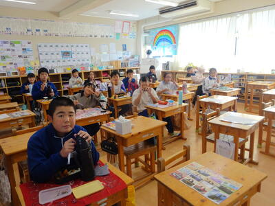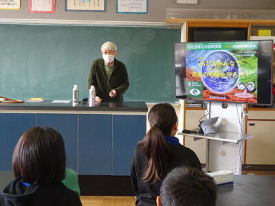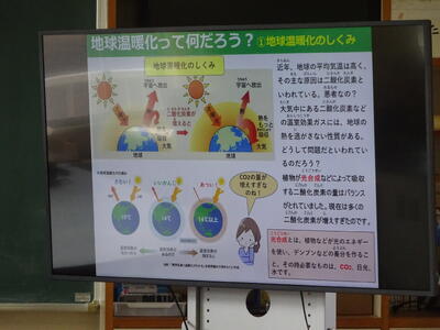 5年生が、総合的な学習で、エコの会の皆さんから環境問題についていろいろと教えていただきました。データから基づいた地球温暖化の現状について説明を聞いたり、簡単な実験に参加したりしました。