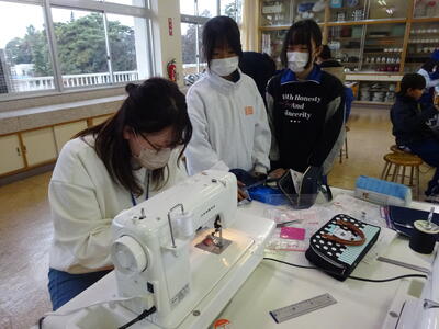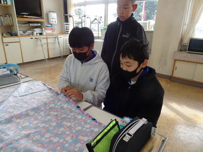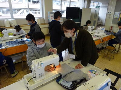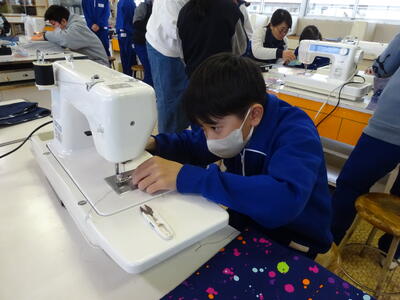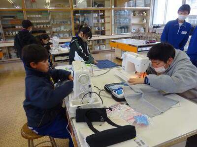 家庭科で、ミシンを使った活動をしました。ミシンを使った作業は1年間で多くはありません。戸惑う児童も多いことから、ボランティアの方にサポートしていただき、大変助かっています。