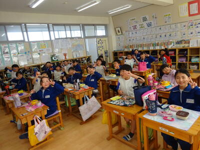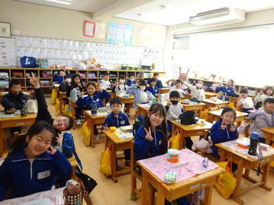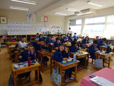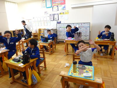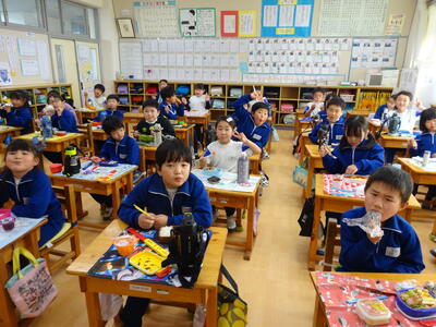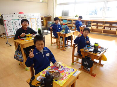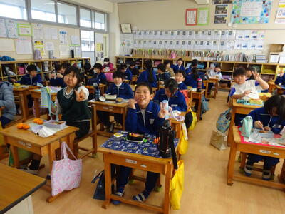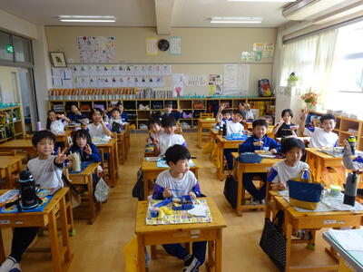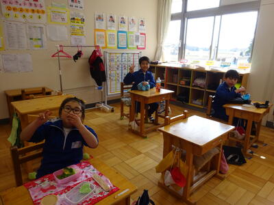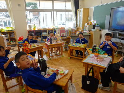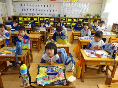 楽しみにしているお弁当の日。それぞれのクラスをのぞくと、みんなとても笑顔で食べていました。キャラ弁を自慢する子、大きなおにぎりをほおばる子。作っていただいた方に感謝のいただきますをしていました。
