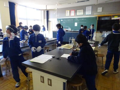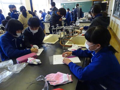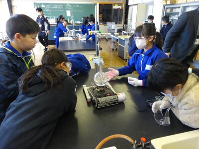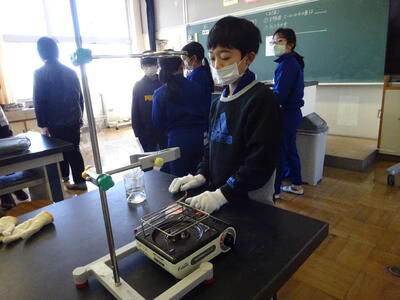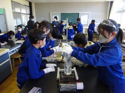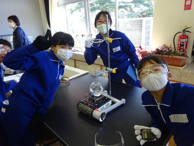 4年生が理科の実験をしていました。水を沸騰させる実験です。安全対策のために、保護メガネや軍手をつけて、真剣に取り組んでいました。