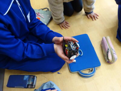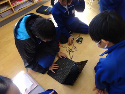 ボランティアで講師の先生に来ていただき、パソコンクラブではプログラミングの活動をしました。マイクロビットを動かすための手順をプログラミングしました。グループに分かれ協力して行い、思い通りに動かすことができていました。