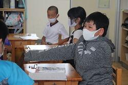 3年生の国語では、意見を仲間分けしてまとめる学習のため、グループでの学びあいです。密にならないようにグループの机の配置に配慮して、意見を共有して仲間分けを行います。