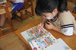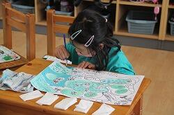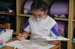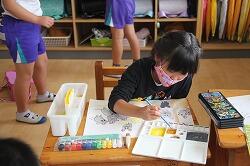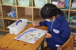 今日は絵画の彩色を行いました。そして今回は、彩色に絵の具が登場です。絵の具は2色までという条件のもと行いました。クレヨンで彩色したところと素敵にマッチングした作品に仕上がっていました。