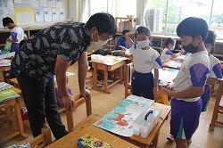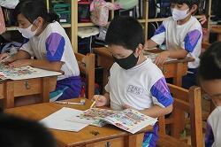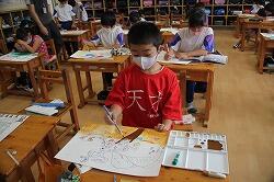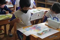 図工では「みてみておはなし」の単元です。物語を読んで、心に残った場面を絵に表します。今日は彩色を行いました。一つの色で濃淡を出したり、または色を組み合わせて濃淡を出すなど工夫して取り組みました。