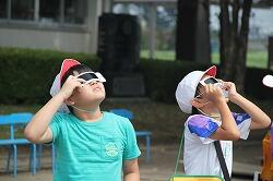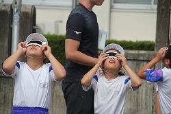 理科では太陽の観察をしました。遮光板を使用して太陽を見ると、初めて見る太陽の姿に歓声が上がりました。そして、自分の影は、太陽に対してどちらの方向にあるかを確認しました。
