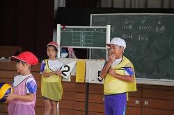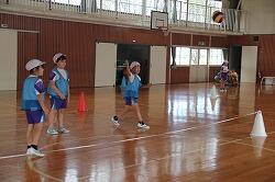 体育ではバレーボールにつながる、バウントゲームを行いました。相手から来たボールをワンバウンドでチームの仲間全員に回します。回し終わったら、相手にバウンドをつけて返します。このときツーバウンドしたら、相手のポイントになります。バウンドをすること自体が、難しいようです。強めのボールで返せるように、練習を重ねていきます。