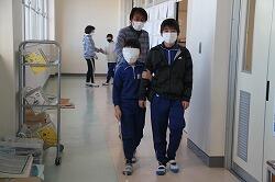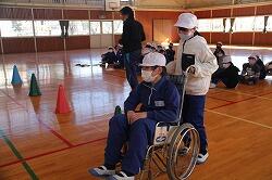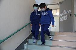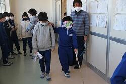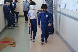 今日は、目の不自由な人に寄り添うためにどうしたらよいかを考えました。そこで、白杖体験を行いました。二人一組となり、一人が目隠しをして、もう一人は安全に歩くために寄り添う係となり校内を歩きました。目の不自由な方の気持ち、そして、寄り添うための思いを体験することができました。