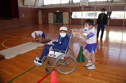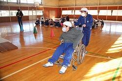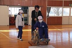 総合学習では福祉について学習しています。今日は、車いすの体験を行いました。見ているよりも操作は難しく、また、乗っている人も運転している人が「右に曲がります」などと配慮をしてくれないとても不安なことを学びました。