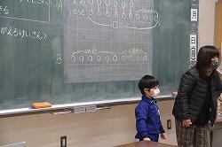1年生の算数は、たし算問題を図に表す学習を行っています。もとのなる数、足す数を丸で表し、意味を書くように指導しています。この学習は2年生の線分図、そして3年以降の数直線への表現につながっています。文章の意味を確実につかませ、表現できるようにおさえていきます。