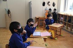 1年生の算数は図形の学習に入ります。三角形の形を組み合わせて、新しい形を作っていく学習です。今日は、基本となる三角形を作る作業を行いました。