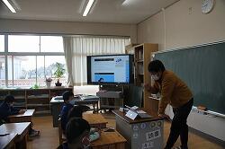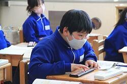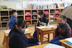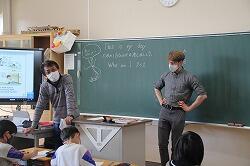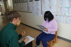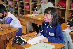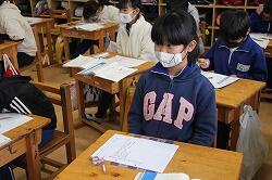「Who am I?」(私は誰でしょう)を学習しています。今日は、担任が、本校の職員の休日の過ごし方について取材をし、そのデータを基に、AETが日記形式で英語で話し、その内容を書き取る聞き取りの学習を行いました。身近な教員の話題のため、子どもたちも興味津々。自然と集中力も高まります。話の内容をメモしていき、「○○先生かな」と予想を立てました。職員の見えない世界を探った喜びもありました。