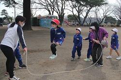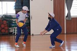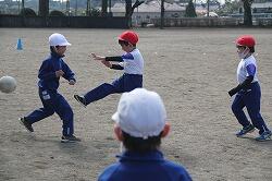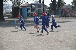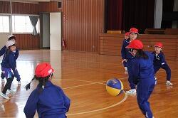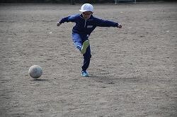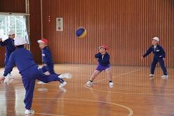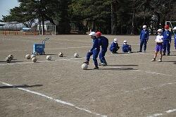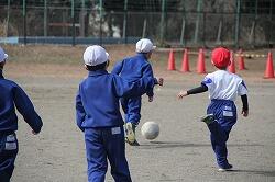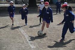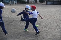 ボールを蹴る運動でミニサッカーを行いました。相手につないでいく気持ちを育てることも目標になります。声を掛け合いながらパスをつないでいく練習を行いました。