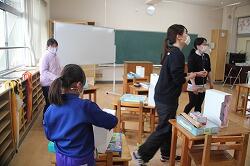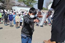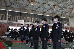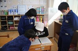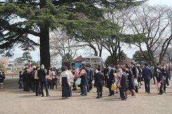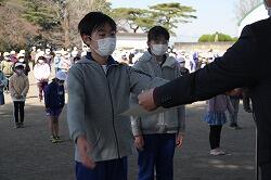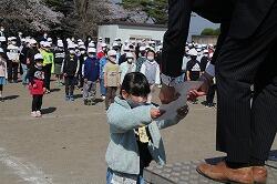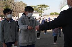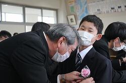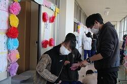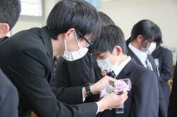 例年ならば5年生が卒業生の胸に花をつけます。しかし。今回も教員が総出で、一声かけながら、花を着けました。