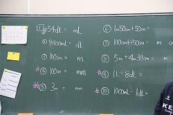 算数は2年の総まとめを行っています。今日は、異なる単位(例えばmとcm mLとdL)同士の計算を復習しました。