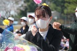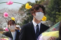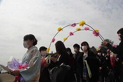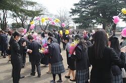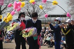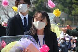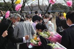 例年なら在校生による見送り。コロナ禍のため今年も教職員による花のアーチ。