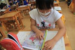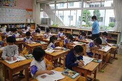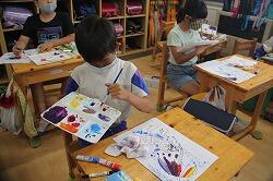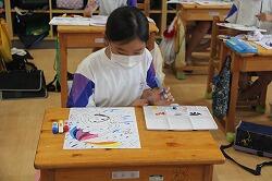 3年生の図工は「わたしの6月の絵」を学習しています。思い思いの6月の下描きをし、今日は彩色です。担任より、色づくりの指導を受けました。例えば赤と黄色の絵の具を混ぜるとオレンジ色ができますが、それぞれの分量の割合を変えると黄色に近いオレンジ、赤に近いオレンジと変化していきます。色づくりをしながら彩色していきました。