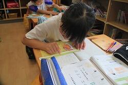 算数では、十の位に繰り下がりのある引き算を学習しています。問題を解きながら、子どもたちからは「面倒だなあ」という声もちらほら聞こえましたが、課題が出されると集中して取り組みました。