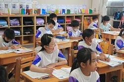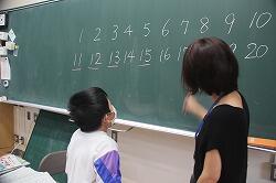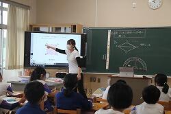 算数の学習では、2人の教員が協力して指導をしています。単元の内容についていろいろなフォーメーションを考え行います。写真は6年生の算数です。クラスを2つに分け、少人数での指導を行っています。3年から6年までの算数の授業で行っています。