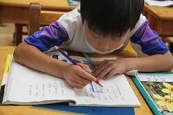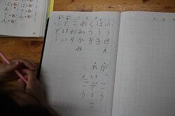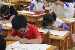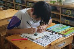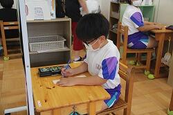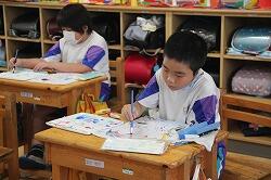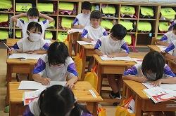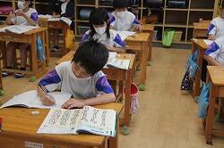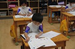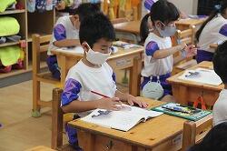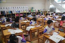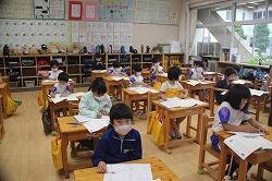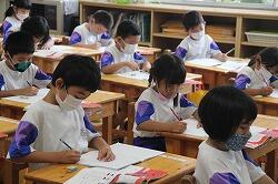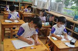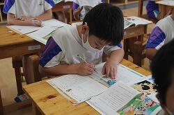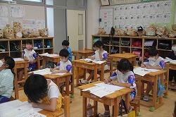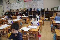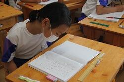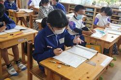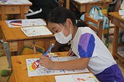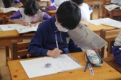 書写は、筆圧を考えて、線を組み合わせていく「下」を練習しました。まっすぐに引いたつもりでも、ちょっとしたはずみで曲がってしまい「なんでだろう」というつぶやきが聞こえました。