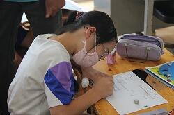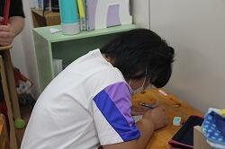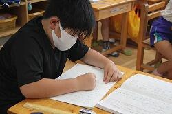 今日は、決まった長さの直線を引く練習をしました。物差しを使い、決まった長さの始点と終点に点を打ち、その点を結ぶ方法です。物差しの使い方がとても上手になってきました。