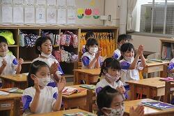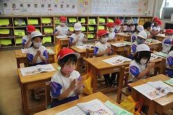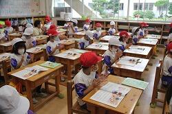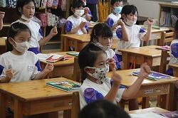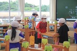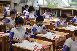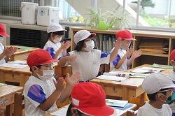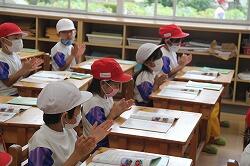 今日は「リズムを打って楽しく歌おう」を目当てに学習を行いました。写真の紅白帽子をかぶって歌う様子は、飛沫を防ぐために、交互の組で歌うためです。児童たちはリズム打ちが大好きです。歌いながらですとなおさらです。しかし、まだまだ全員で元気よく歌うことができないのが残念です。