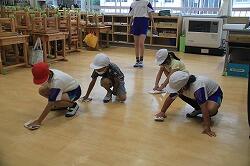 今日は「マットを使った運動遊び」を行いました。4つのコースを作り、手をついて足を上げたり、転がったり、回転したりと、いろいろな動きを練習しました。