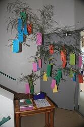 明日は七夕。5年生の廊下に七夕飾りが出現しました。通りかかった児童が思い思いの願いを書いています。中には、担任の男性教諭の幸せを願うものまでありました。