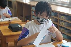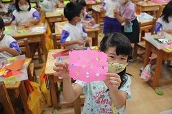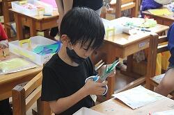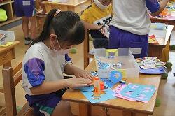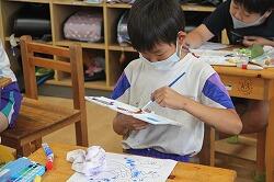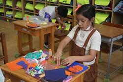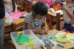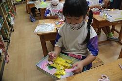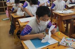 図工では、「ちょきちょきかざり」を学習しました。ここでは、自分の想像したことを紙を切って表します。あわせて、はさみの使い方も習得していきます。切る紙の枚数が増えるごとに、作品の精緻さが高まっていきました。