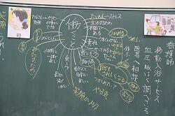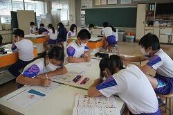 今日は「働く」とはどういうことか考えました。看護師として働く母の物語を通して、母の思いを考えていきました。6年生にもなると、おぼろげながらにも将来の仕事を考えるようになります。自分に置き換えながら、最後に担任から「働くってどういうこと」の質問に、子どもたちは一心不乱にノートに書きこんでいきました。「つらいこともあるけど楽しい」「人のためになることで楽しくなる」「まわりを笑顔にすることができる」等々、深く考えることができました。
