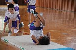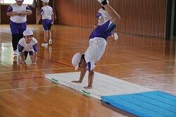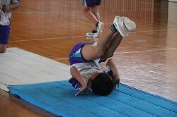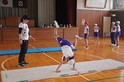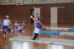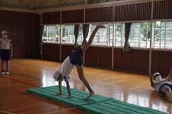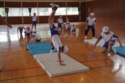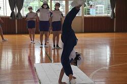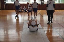 6年の体育はマット運動です。自分の目標を決めコース別の練習を行いました。開脚前転・後転グループ、側転グループ、そして逆立ちグループに分かれました。女子チームが大技に挑戦していました。